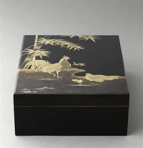 Rechthoekige gouden trommel met japans motief met afbeeldingen van vogels en druivenrank van n.v. ...