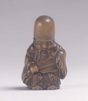 Netsuke: Daikoku [Daikoku God]; Netsuke in the form of a man, seated, hatted, bearded with a drum