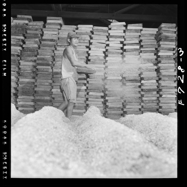 ほぐした原料に筋をつけ種コウジをまく