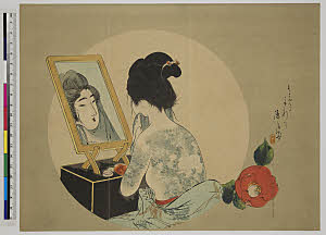 鏡に向かうもろ肌脱ぎ刺青女