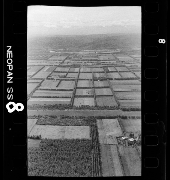 防風・防霧林の美しい格子模様.一年一作のため1経営当り数ヘクタール以上を必要とする畑作地帯.十勝平野