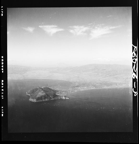 銚子半島を九十九里浜側から望む.燈台のあるのが犬吠埼.半島北側に利根川口が見え,その向こうに鹿島灘が続く(銚子)