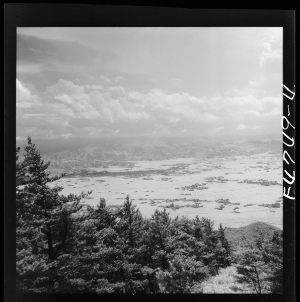1 鼻高山からみた簸川平野.斐伊川が左端の宍道湖へそそいでいるのがみえる