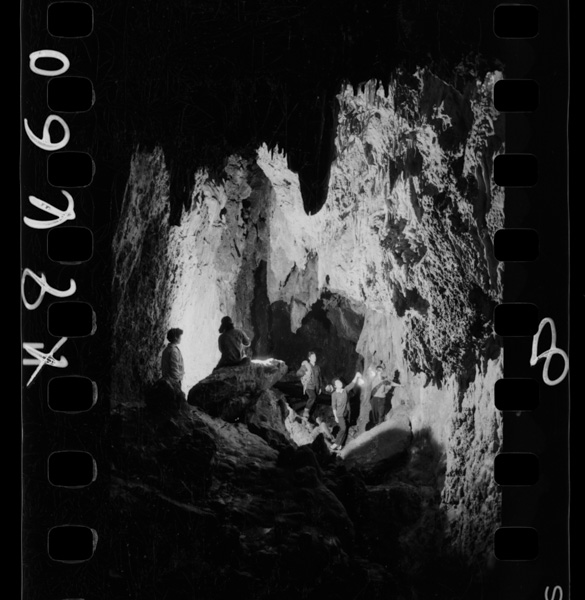 洞底の水や石灰華は電光に映えて美しい