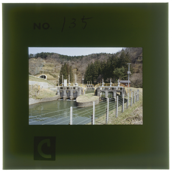 〔右〕水田へ配水するため土盛りをして水を通したつきぜき(築堰) 現在はその上にコンクリートの溝渠を通して同じ目的に使っている...