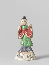 Vrouwenfiguur in groen en rood gewaad en blauw onderkleed