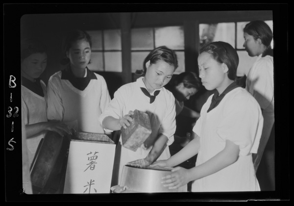 右は24台の高機を備えた大広間で 織りの実習を受ける婦人のグループ 手仕事の断絶は果たして埋まるだろうか