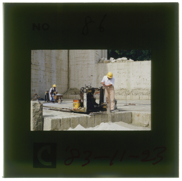 平場堀機による露天堀 チェーンソーが溝を切り込む(酒井石材店採掘所で)