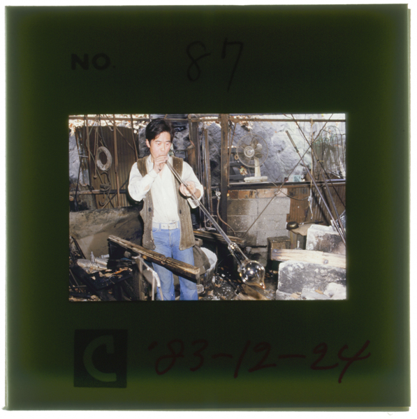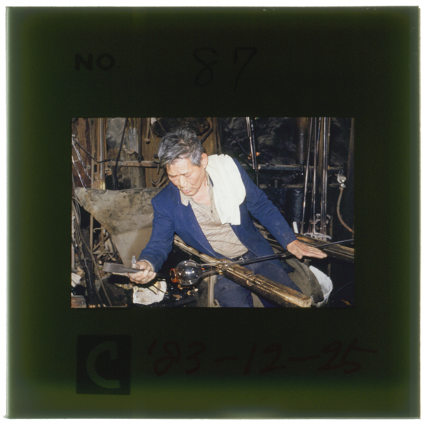 宙吹きによる丸ボヤの製造 〔左〕竿を回しながら種に息を吹き込み丸く成型する 難波秀敏さん