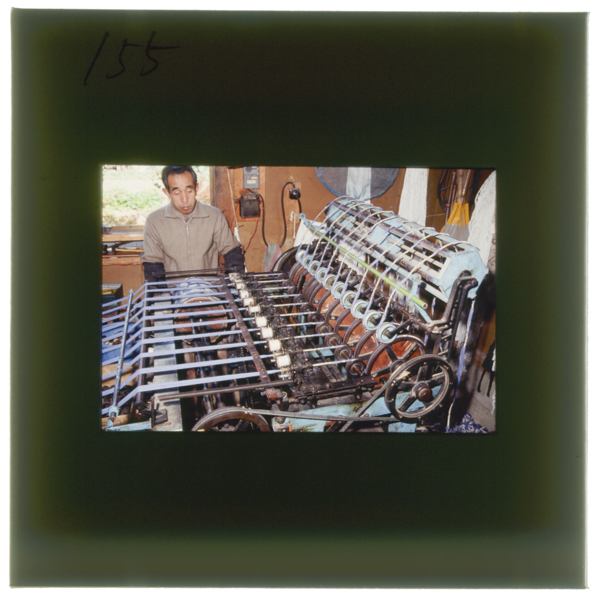 機械くびり。ドラムの下絵に合わせ経糸をくびっている。くびり機械は明治末期に早くも考案された。