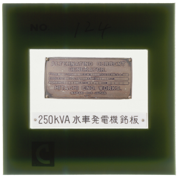 峰之沢鉱山納250kVA水車発電機の銘板 製造年1912とある(小平記念館に展示)