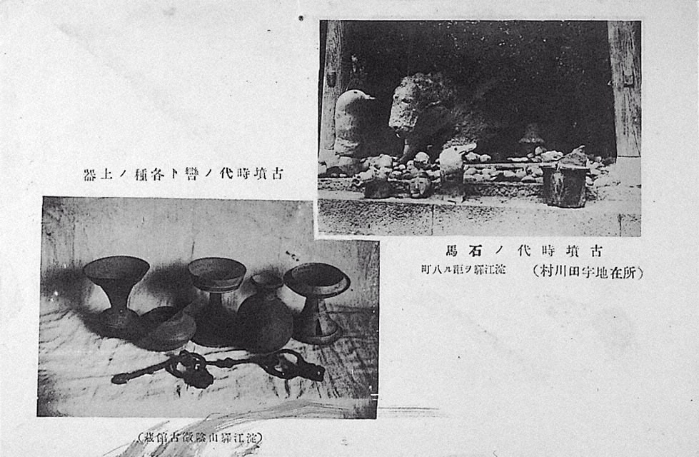 古墳時代の石馬(所在地宇田川村)淀江驛ヲ距ル八町・古墳時代の轡ト各種ノ土器(淀江驛山陰徴古館藏)