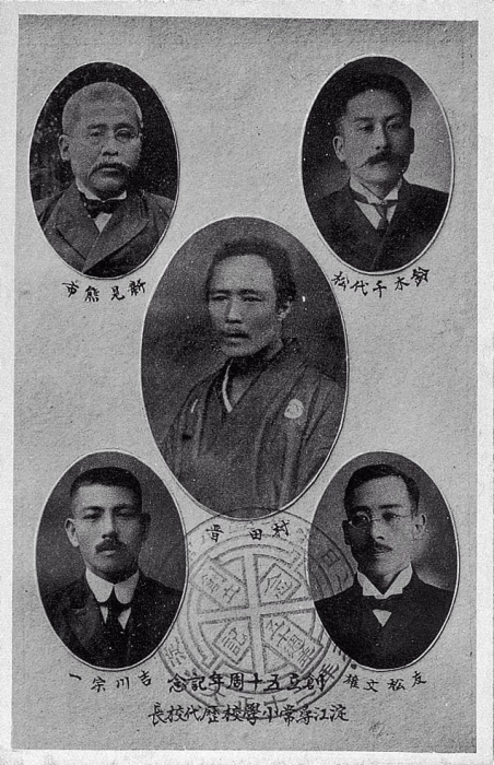 創立五十周年記念淀江尋常小學校歴代校長(鈴木千代松・新見熊市・村田晋・友松文雄・吉川宗一)