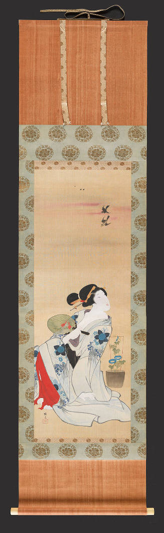 Beauty Holding a Fan Seated beside a Pot of Morning Glory