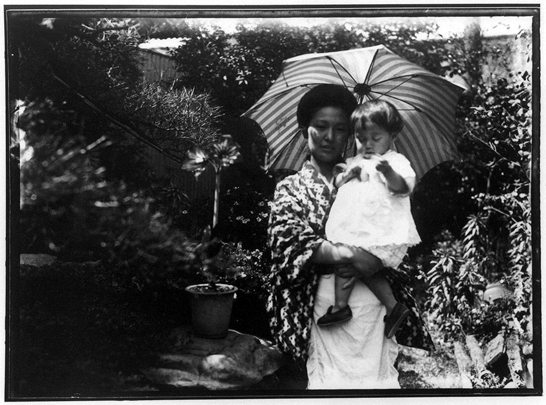 日傘をさして幼児を抱く女性