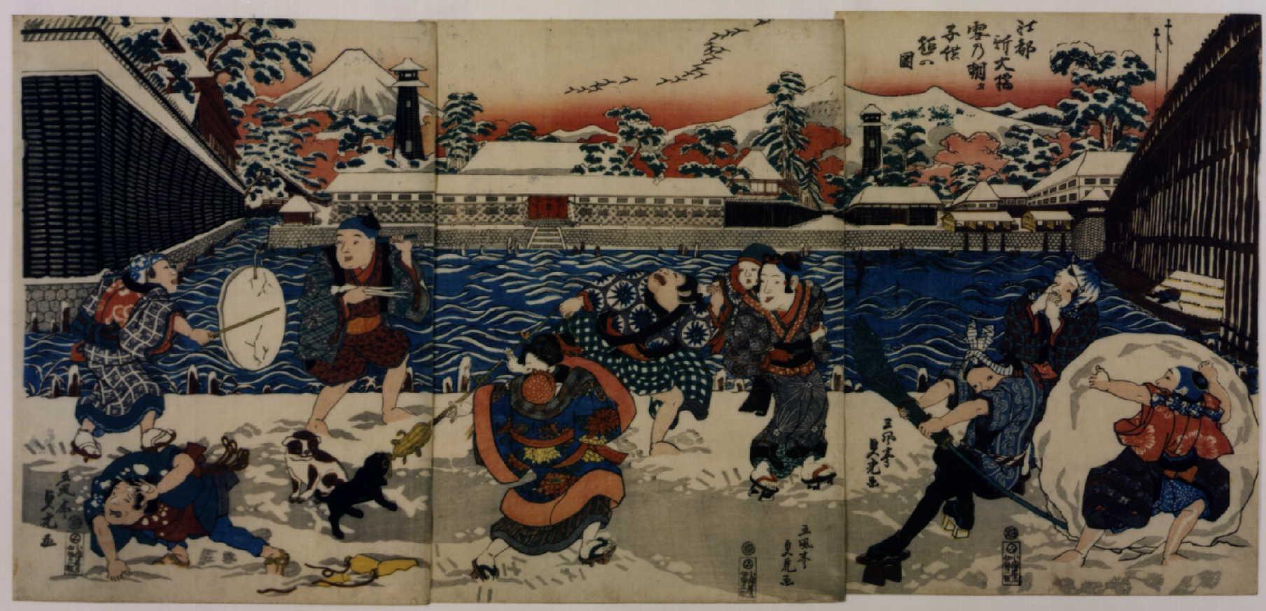 江都新大橋雪の朝タ子供遊の図