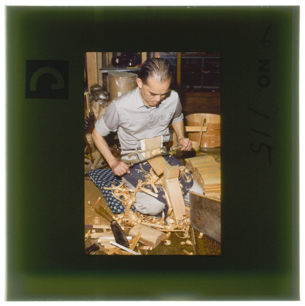 ○2(○の中に2)よく枯らしたサワラ材を削って組み合わせる 桶屋の川井さんの周りには快い木の香がただよう