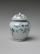 Covered jar with flowering plants in panels, flower sprays and scrolls