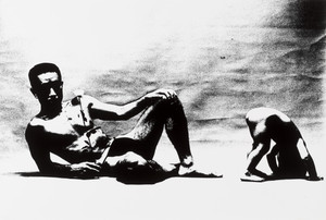 Catching Fireflies. Man with a broom (?) falls backwards into river